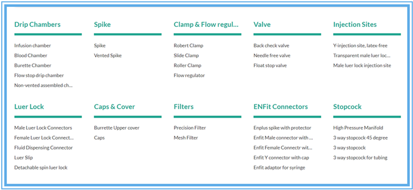 2. 組件產(chǎn)品 : 滴注腔,過濾器,尖峰,夾鉗和流量調(diào)節(jié)器,閥門,注射部位,魯爾鎖,蓋和蓋,ENFit連接器,旋塞閥